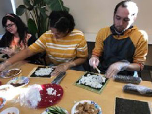 授業の他での取り組みとしては、週に1、2回、日本語テーブル(Japanese Language Table)を行いました。カードゲームを使ったり、日本人学生の協力を得て日本語でテーマを自由に決め、会話をしたりして日本語の練習をしました。また、折り紙、お箸の使い方(お箸のタブー)、おにぎりや手巻き寿司作りなど、日本ならではの文化を紹介し、実際に体験をしてもらいました。学生は、日本の文化一つ一つにとても興味をもって、話を真剣に聞いてくれました。この日本語テーブルでの活動を通して、私自身、日本人であるにも関わらず知らなかった一つ一つの文化や習慣の本当の意味を学ことができ、そして、日本には日本独自のたくさんの文化があるのだと実感することができました。そして、学生たちが日本語や日本の文化に興味をもって学ぼうとしてくれていることにとても嬉しく思ったのと同時に感謝の気持ちでいっぱいになりました。