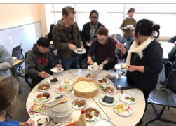 今期は私が担当する2つの中級クラスと上級クラスの学生を対象に和食を一緒に作り、数多くの品を堪能するフードパーティーを実施しました。和食例はざるそば、ざるうどん、ざる茶そば、親子丼、唐揚げ、焼きそば、たこやき、たいやき、和風ドレッシングサラダ、手作り味噌汁、巻きずし、日本茶数種類でした。この中で巻きずし、たこ焼き、たい焼きは学生が実際に作って、和食調理を体験しました。なかには羊羹を手作りで持参する学生もいました。この機会にクラス間で交流のなかった3クラスの学生が日本語を使ったゲームや自己紹介を通じて仲良くなり、のちにはスタディ・セッションや留学プログラムの情報交換など仲を深めていました。